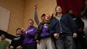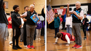 That’s when Gabriel Romanenko ‘28 and other athletes from the College found themselves — along with some elementary school teachers — standing precariously on one foot in the school gymnasium while a crowd of young students thunderously counted down the seconds as they tried to hold the pose.