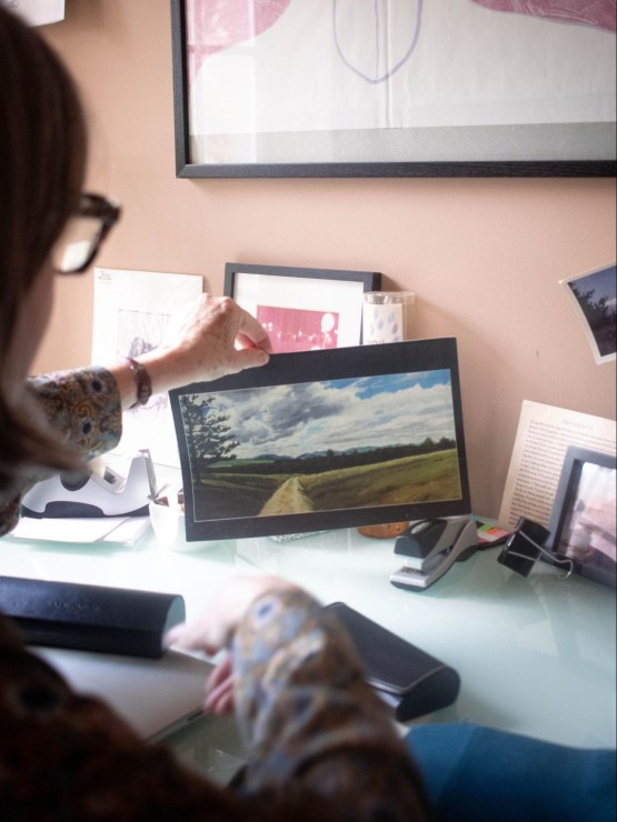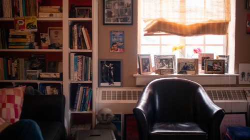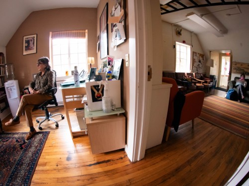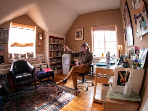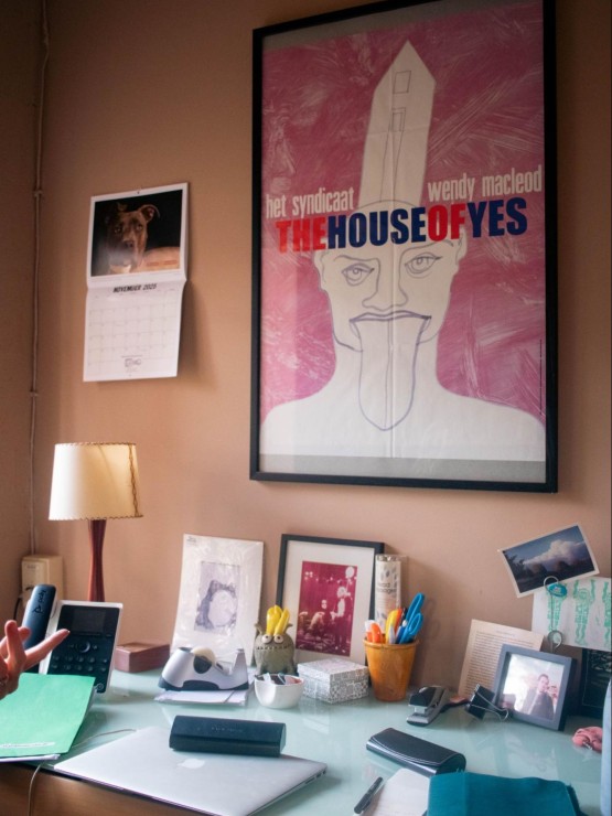The office itself, which MacLeod moved into in 2008, previously belonged to her former teacher and mentor, Thomas Turgeon P’89,’93 H’08. In a peculiar architectural quirk, it is accessible only after walking through the Reading Room in Hill Theater, where she teaches playwriting. Once inside, though, it is warm and inviting with hardwood floors; a couch and generously cushioned chair; and light pouring in through windows on the south and west sides.